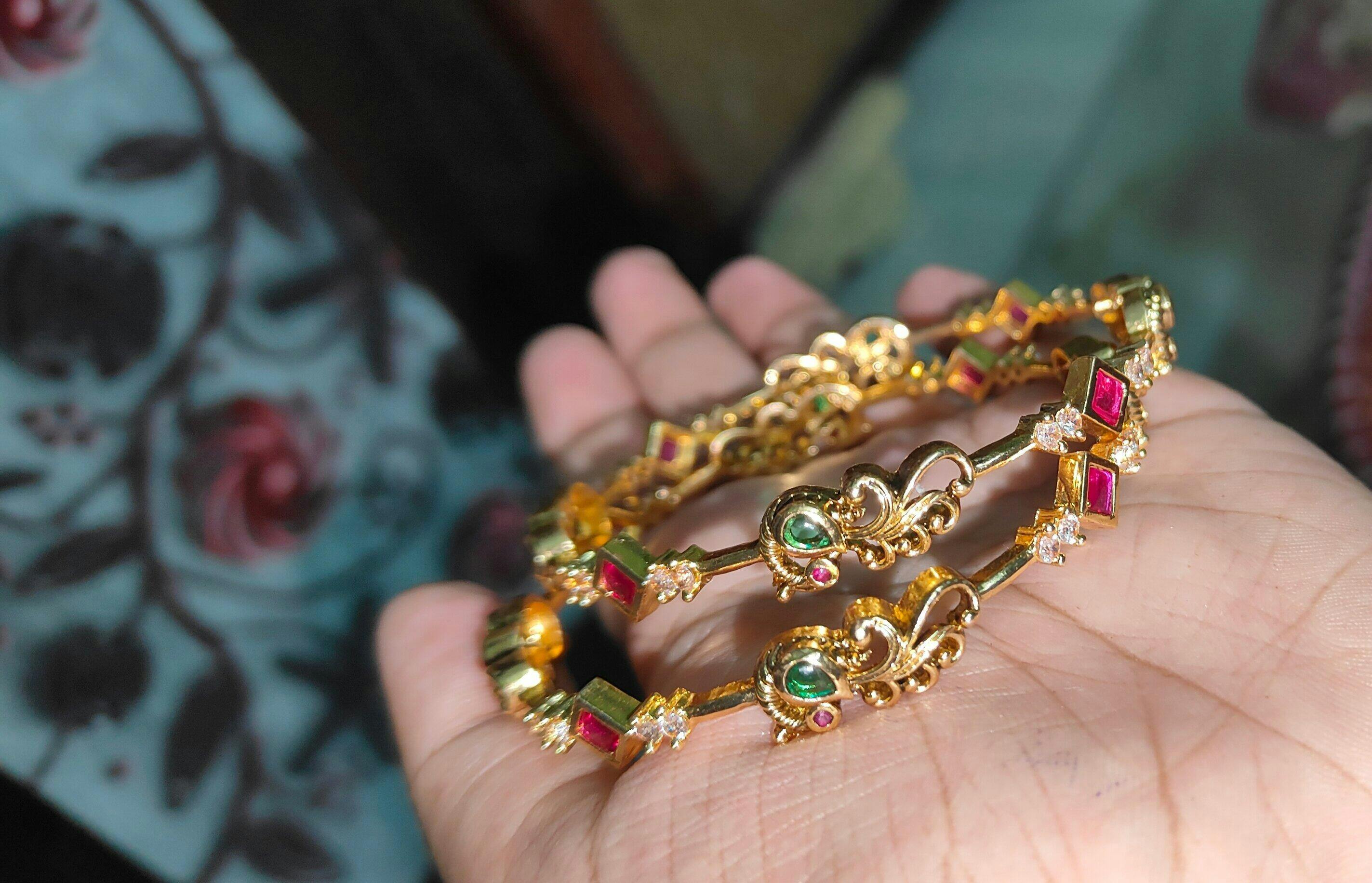 Indulge in the elegance of our exquisite gold bangles, designed to bring a touch of sophistication to any outfit. Each piece features intricate detailing, showcasing a beautiful blend of artistry and craftsmanship. The delicate incorporation of ruby and sparkling stones adds a vibrant dash of color, making these bangles a perfect accessory for festive occasions or daily wear. Crafted to perfection, they not only highlight your personal style but also celebrate the rich heritage of traditional jewelry. Whether paired with a saree or casual wear, these bangles are the ideal statement piece that can elevate your look effortlessly. Treat yourself or a loved one to this timeless adornment that captures the essence of elegance and grace. Explore our collection to find the perfect match for your unique style today! #jewelrydesign, #goldbangles, #traditionaljewelry, #handcrafted, #luxury, #fashionaccessories, #jewelrylover, #styleinspo, #festivewear, #urbanjewelry, #elegance, #accessories, #rubyjewelry, #sparklingjewels, #artisanmade, #stylish, #fashiontrends, #womensfashion, #ethnicwear, #finejewelry, #uniquejewelry, #glamour, #specialoccasions, #delicatejewelry, #modernartistry, #jewelrycollection, #elegantstyle, #shopnow, #rarefinds, #shoppingaddict